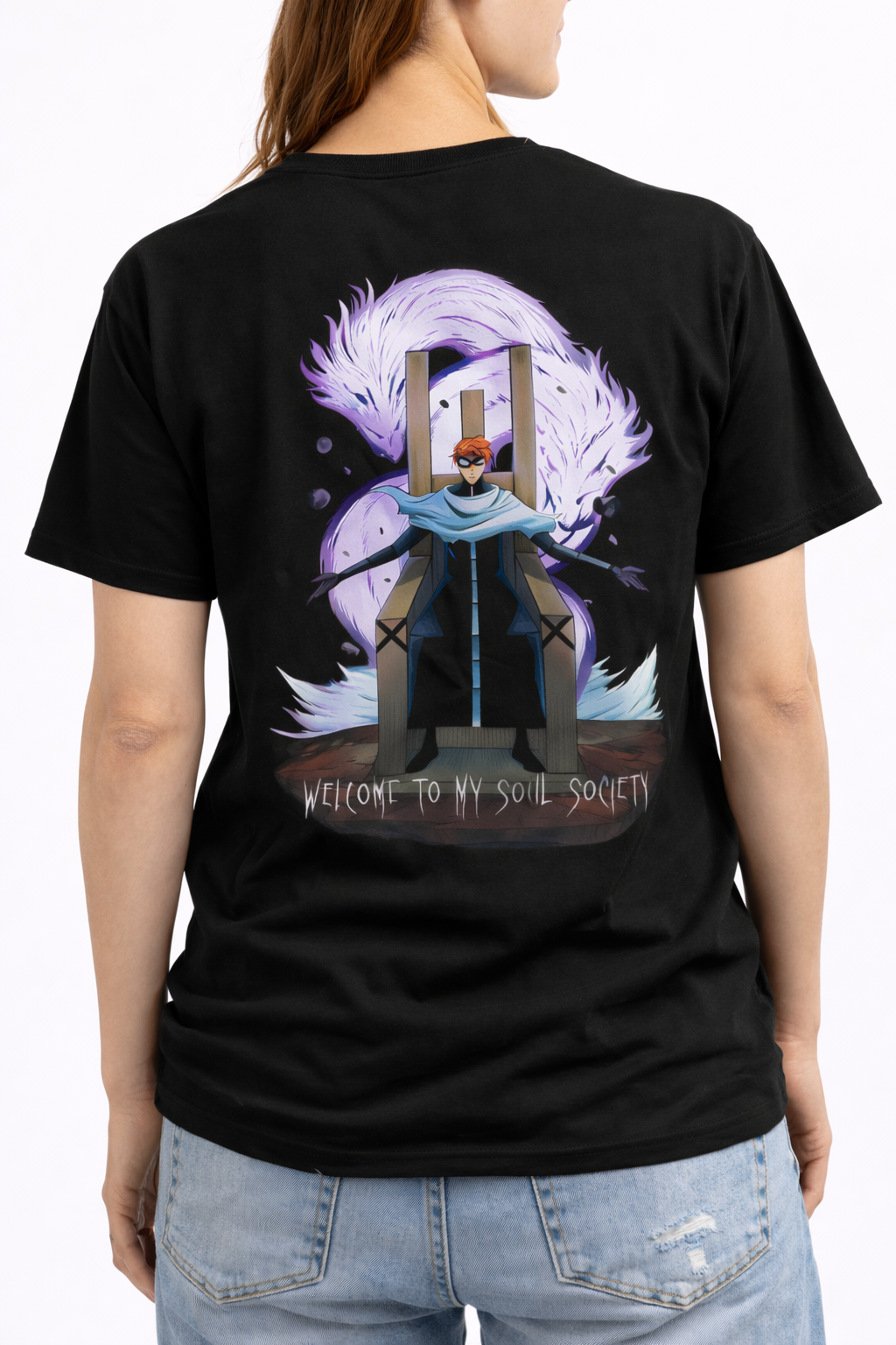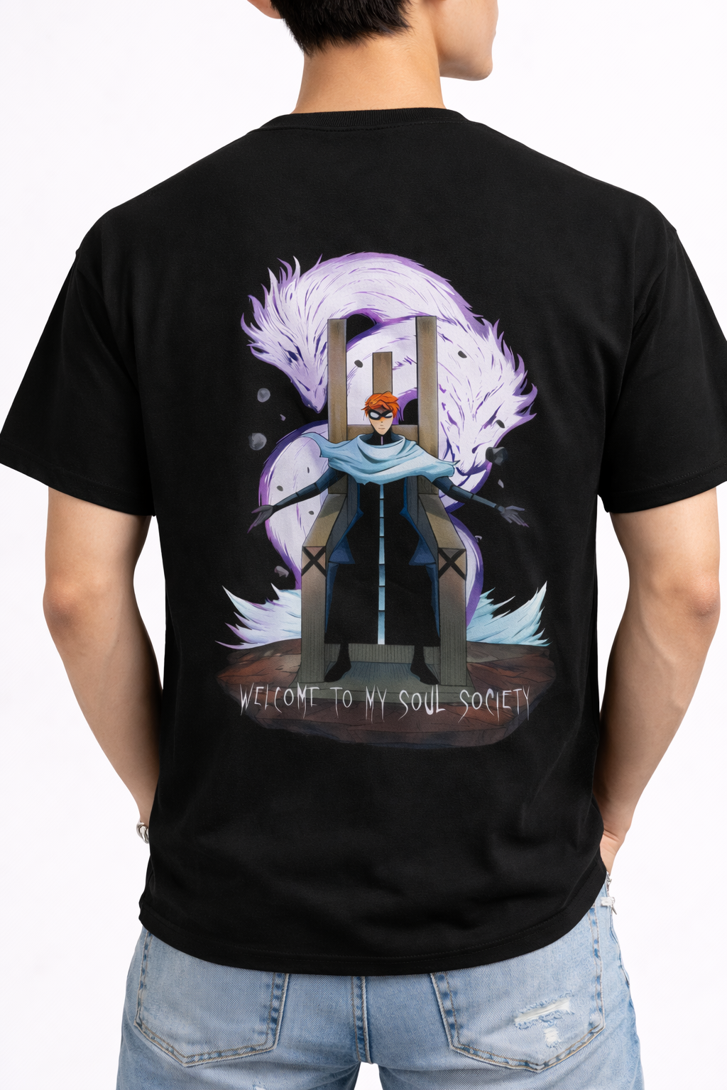 Command attention with the Dark Ascension Anime-Inspired Tee. This powerful piece from our Artistic Mashup collection portrays a legendary antagonist in his most transcendent form, seated upon a looming throne of power. Backed by a magnificent, glowing purple dragon spirit and featuring the chilling declaration, “Welcome to my Soul Society,” this design captures the calculated dominance and sheer presence of one of anime’s greatest masterminds.